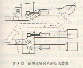 ③反轉(zhuǎn)通風(fēng)機(jī)葉輪旋轉(zhuǎn)方向反風(fēng)。這種方法是調(diào)換電動(dòng)機(jī)電源的任意兩相接線,使電動(dòng)機(jī)改變轉(zhuǎn)向,從而改變通風(fēng)機(jī)葉輪的旋轉(zhuǎn)方向,使井下風(fēng)流反向。這種方法基建費(fèi)較少,反風(fēng)方便,但是一些老型號(hào)的軸流式通風(fēng)機(jī)反風(fēng)后風(fēng)量達(dá)不到要求。一些新型軸流式通風(fēng)機(jī),將后導(dǎo)葉設(shè)計(jì)成可調(diào)節(jié)角度的,反風(fēng)時(shí),將后導(dǎo)葉同時(shí)扭一角度,反風(fēng)后的風(fēng)量即能滿足要求。