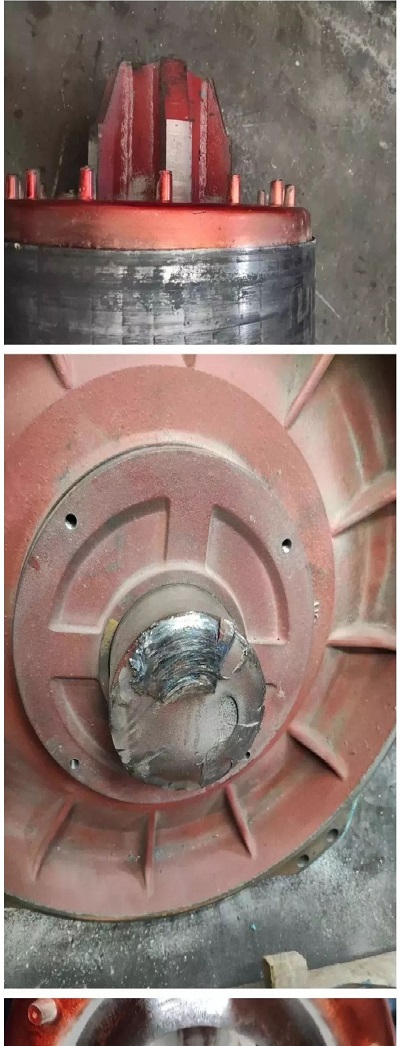 某修理公司承接了一臺YE3-355-6 380V 50Hz 220kW電機(jī),該電機(jī)實(shí)際配套破碎設(shè)備,軸采用幅板結(jié)構(gòu),斷裂口在軸伸端幅板端部位置,因為軸斷裂,電機(jī)已嚴(yán)重掃膛;該電機(jī)采用皮帶輪傳動,使用20天左右。以下是現(xiàn)場拍到的斷口圖片: