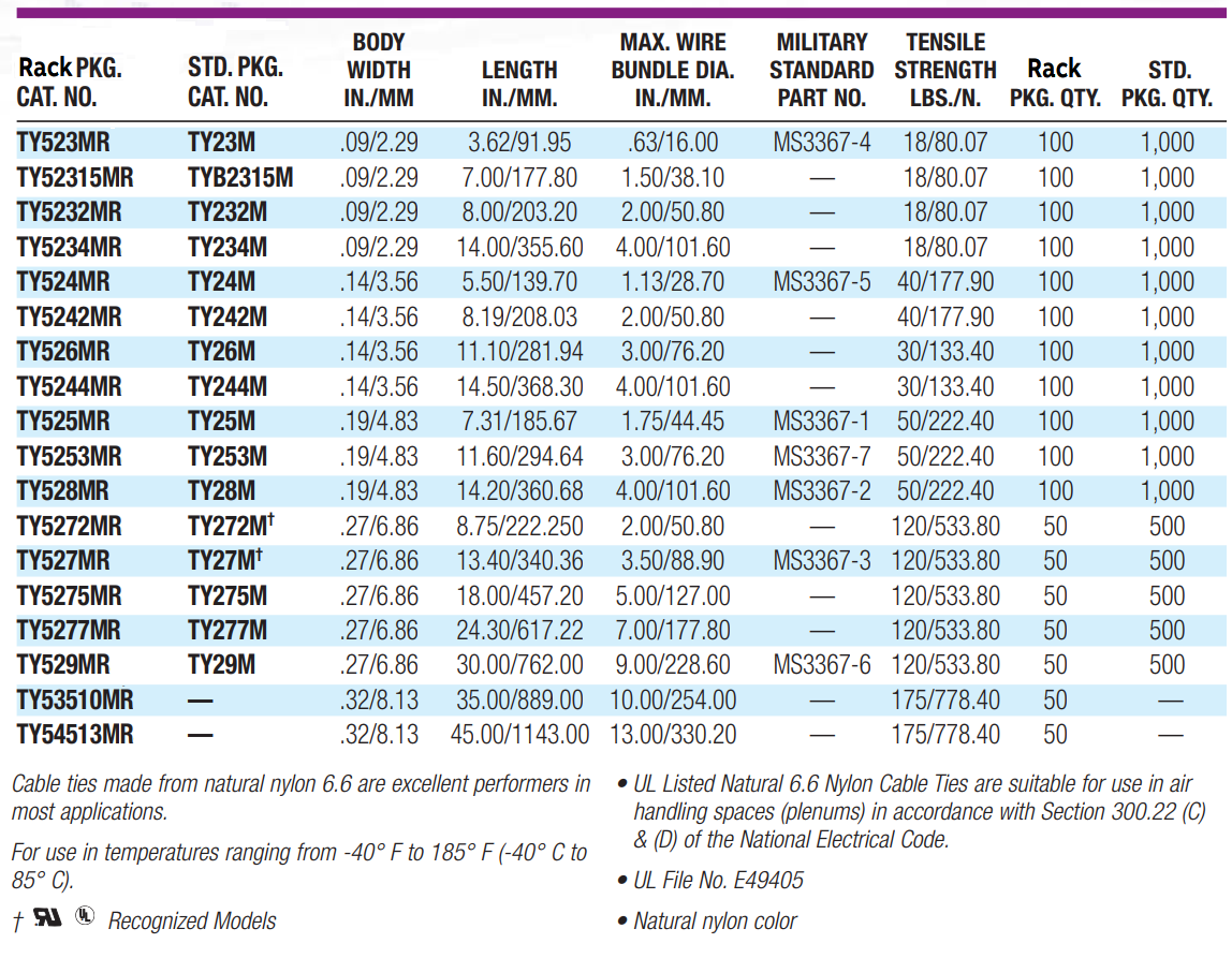 ABB 通貝(Thomas&Betts) Ty-Rap系列 本色尼龍66 電纜扎帶 Ty-Rap系列 高性能尼龍6.6電纜扎帶 TY25M (TY525MR), TY23M (TY523MR), TY232M (TY5232MR) TY24M (TY524MR), TY242M (TY5242MR), TY26M (TY526MR) TY27M (TY527MR), TY28M (TY528MR), TY29M (TY529MR)