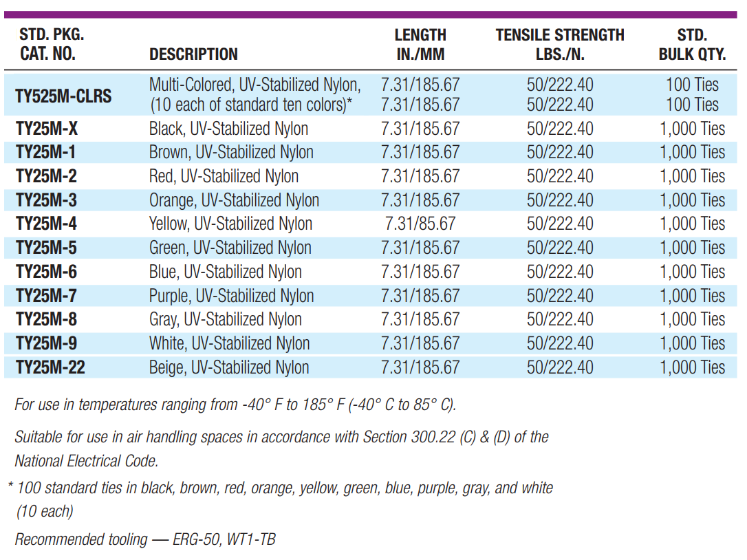 * 100 個標準扎帶,顏色有黑色、棕色、紅色、橙色、黃色、綠色、藍色、紫色、灰色和白色(每種顏色10 個)推薦扎帶工具 —— ERG-50、WT1-TB