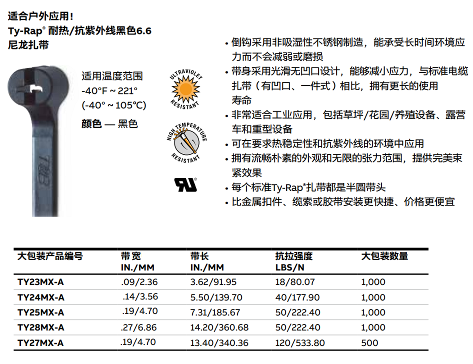- Ty-Rap系列 耐熱/抗紫外線黑色尼龍66線纜扎帶 Ty-Rap®系列 高性能電纜扎帶
