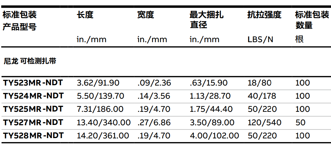 Ty-Rap® 可檢測扎帶擁有以往Ty-Rap® 電纜扎帶的所有優(yōu)點。帶身平滑且采用完美可調(diào)設(shè)計;帶頭采用高性能不銹鋼制作,能夠完美緊束且綁扎力極佳。此外,使用本系列扎帶絲毫不會影響您產(chǎn)品的固有特性。